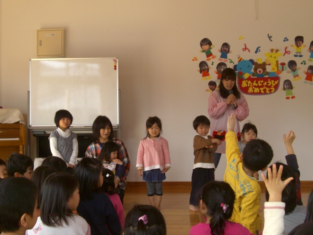 3月7日(月) 2月うまれと3月うまれの誕生日会がありました。 誕生児の紹介では、「名前を教えてください」「何歳になりましたか」「何をして遊ぶのがすきですか」などの質問に、「レゴが好き」「おままごとをするのが好き」など、元気に答えてくれました。 |